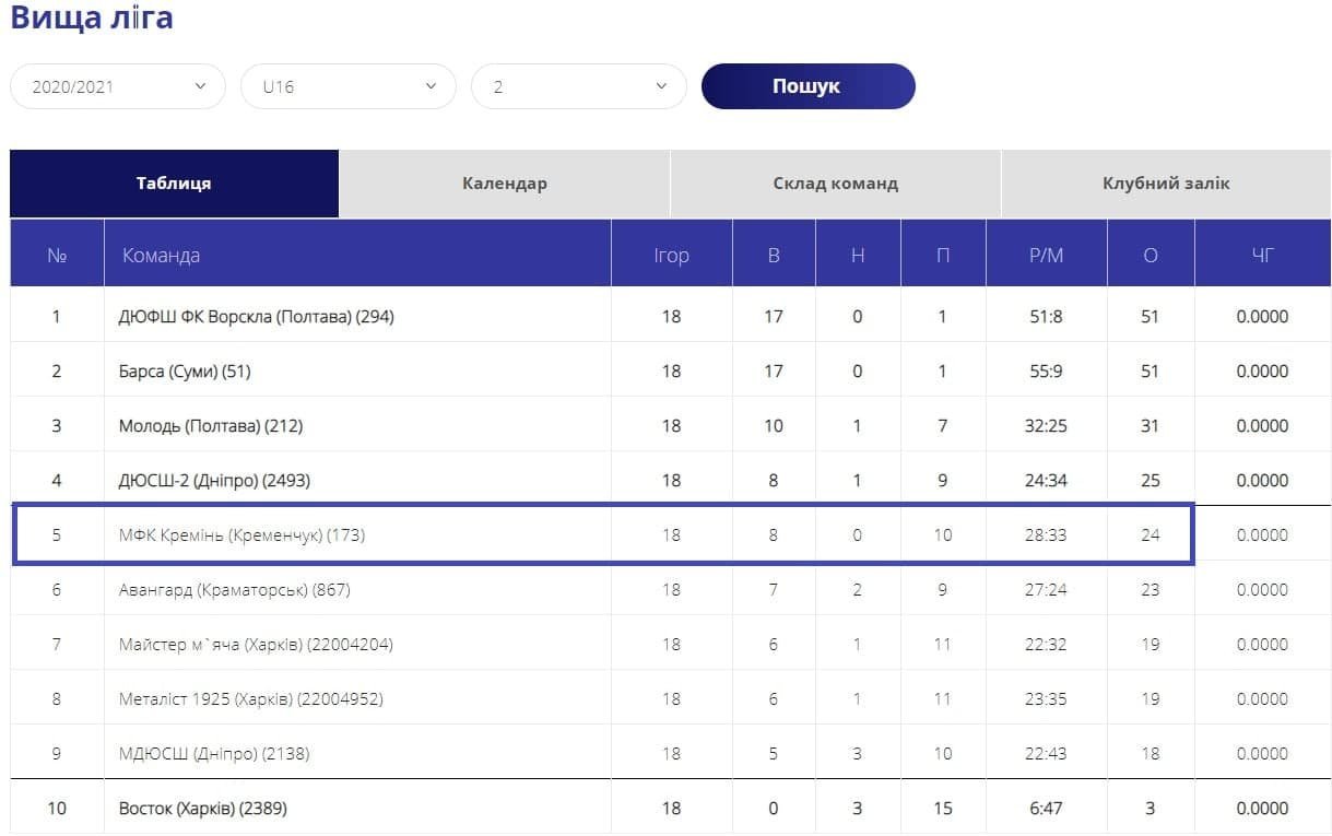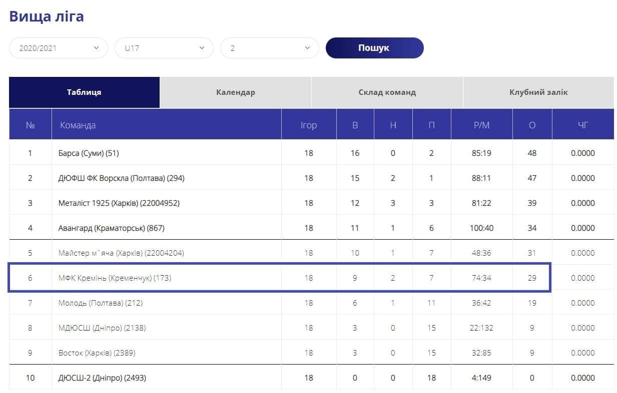 Матчами проти харківського «Майстра м’яча» юнацькі команди «Кременя» завершили сезон у Вищій лізі ДЮФЛУ. За підсумками чемпіонату «синьо-білі» у загальному заліку стали 4-ми серед десятьох учасників.
