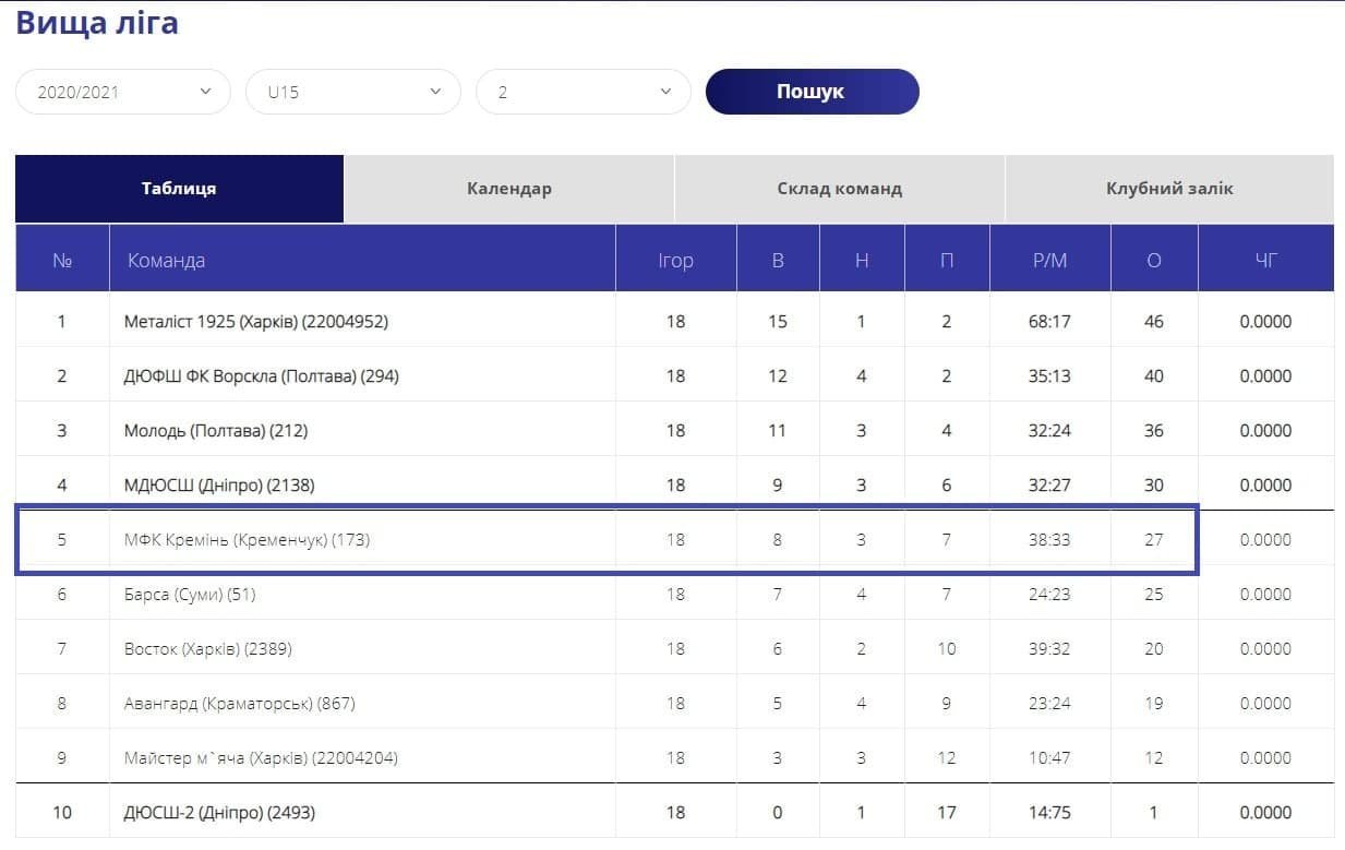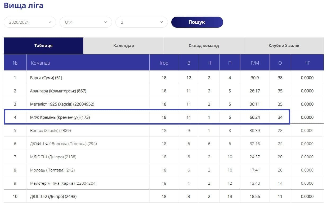 Вихованці Сергія Мурадяна поставили «жирну крапку» в чемпіонаті, розгромно перемігши на виїзді харків’ян. Одразу четверо нападників «Кремінь» U-14 увійшли в десятку кращих нападників. Очолив список Богдан Степанов (20 голів), на 4 місці Владислав Бондаренко (9), далі Максим Скрипкевич (7) та Іван Лихоліт (6).