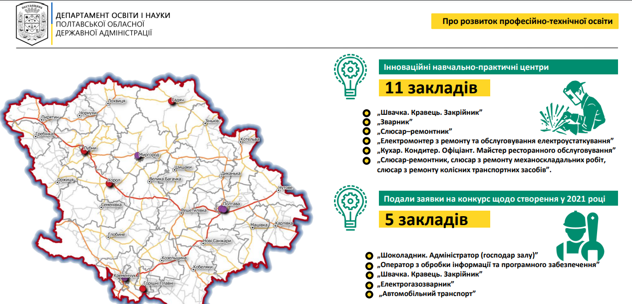 Заступник директора Департаменту освіти і науки Галина Власюк повідомила, що зараз триває модернізація 7 закладів професійної освіти, на базі яких створять центр професійно-технічної освіти та 2 вищих професійних училища.