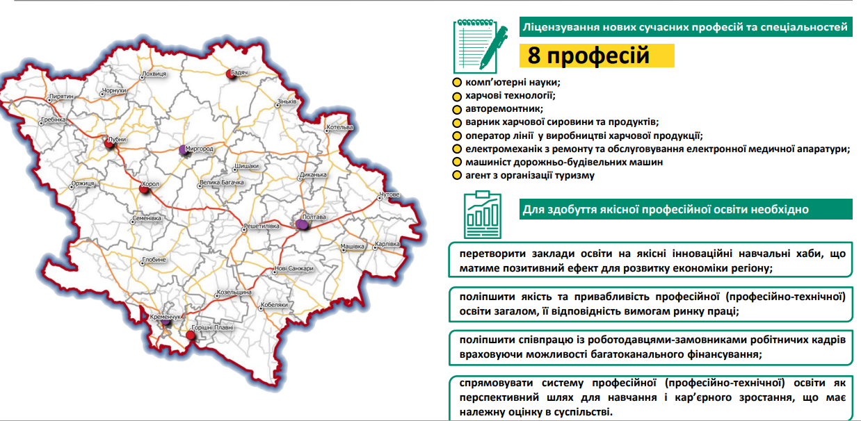 Стратегією розвитку Полтавської області до 2027 року передбачається придбання обладнання та навчальної техніки для 13 закладів професійної освіти на суму 58,7 мільйонів гривень. Ще 41,9 мільйонів виділять на створення безпечних умов навчання для здобувачів освіти.