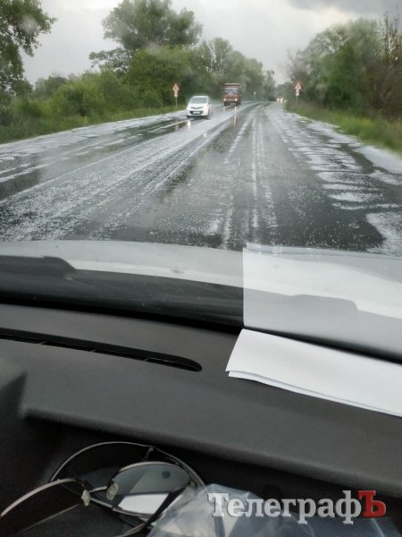 Під Кременчуком дорогу засипало градом, про що у редакцію повідомили очевидці. Так виглядає зараз дорога на Горішні Плавні.