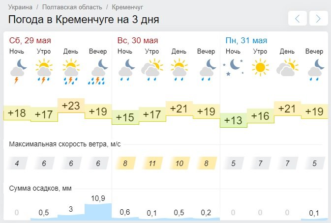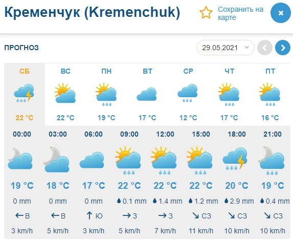 На смену достаточно жаркой и сухой погоде, которая господствовала в Кременчуге среди рабочей недели, на последних выходных весны придёт гроза с дождём.
