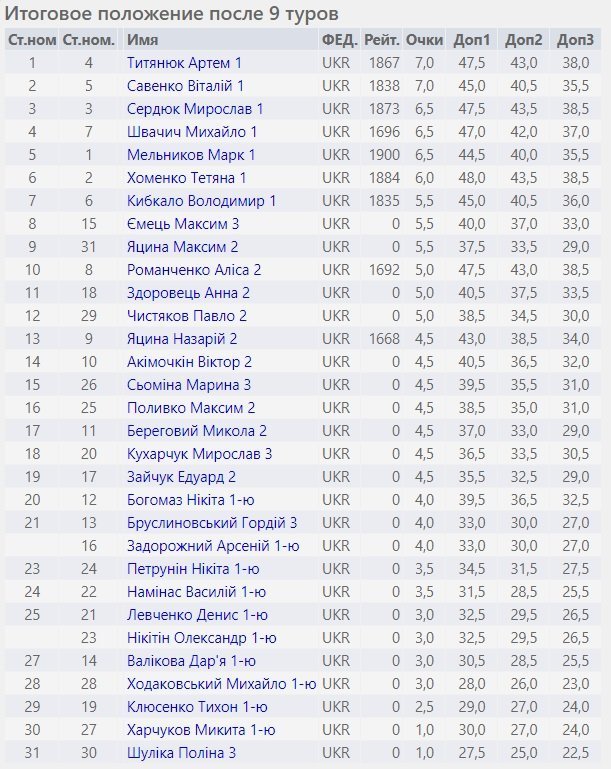 Два учасники турніру виконали норми шахових розрядів. Третій шаховий розряд отримав Нікіта Богомаз, а другий – Максим Ємець.