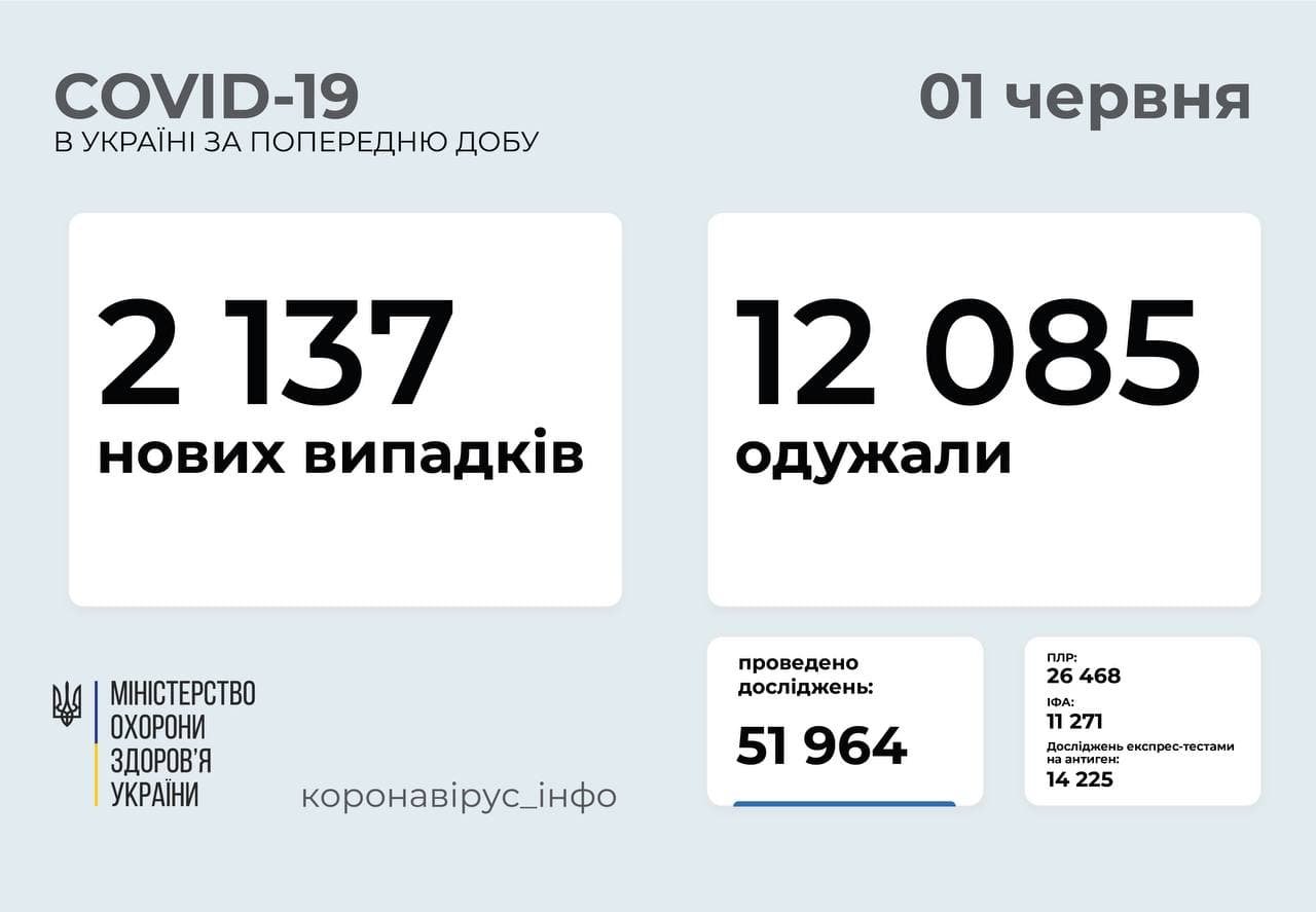 Усього в країні виявили 2137 нових випадків COVID-19, захворіло 56 працівників медичної галузі та 91 дитина. Одужало 12085 людей, а 163, на жаль, не змогли подолати хворобу.