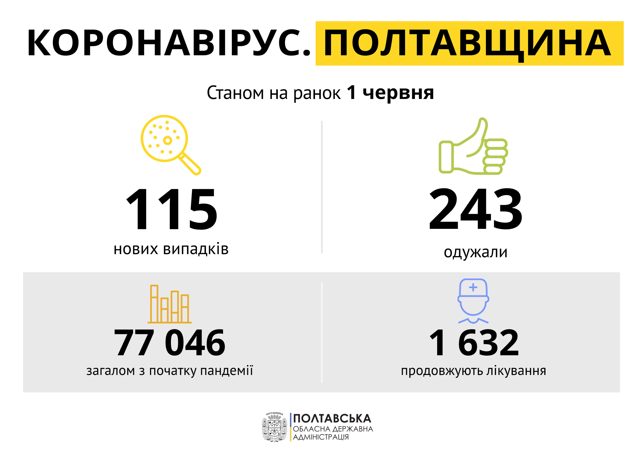 Полтавський обласний лабораторний центр МОЗ інформує, що станом на ранок 1 червня в області на COVID-19 хворіє 1632 громадянина, з яких у 115 коронавірус виявили за останню добу.