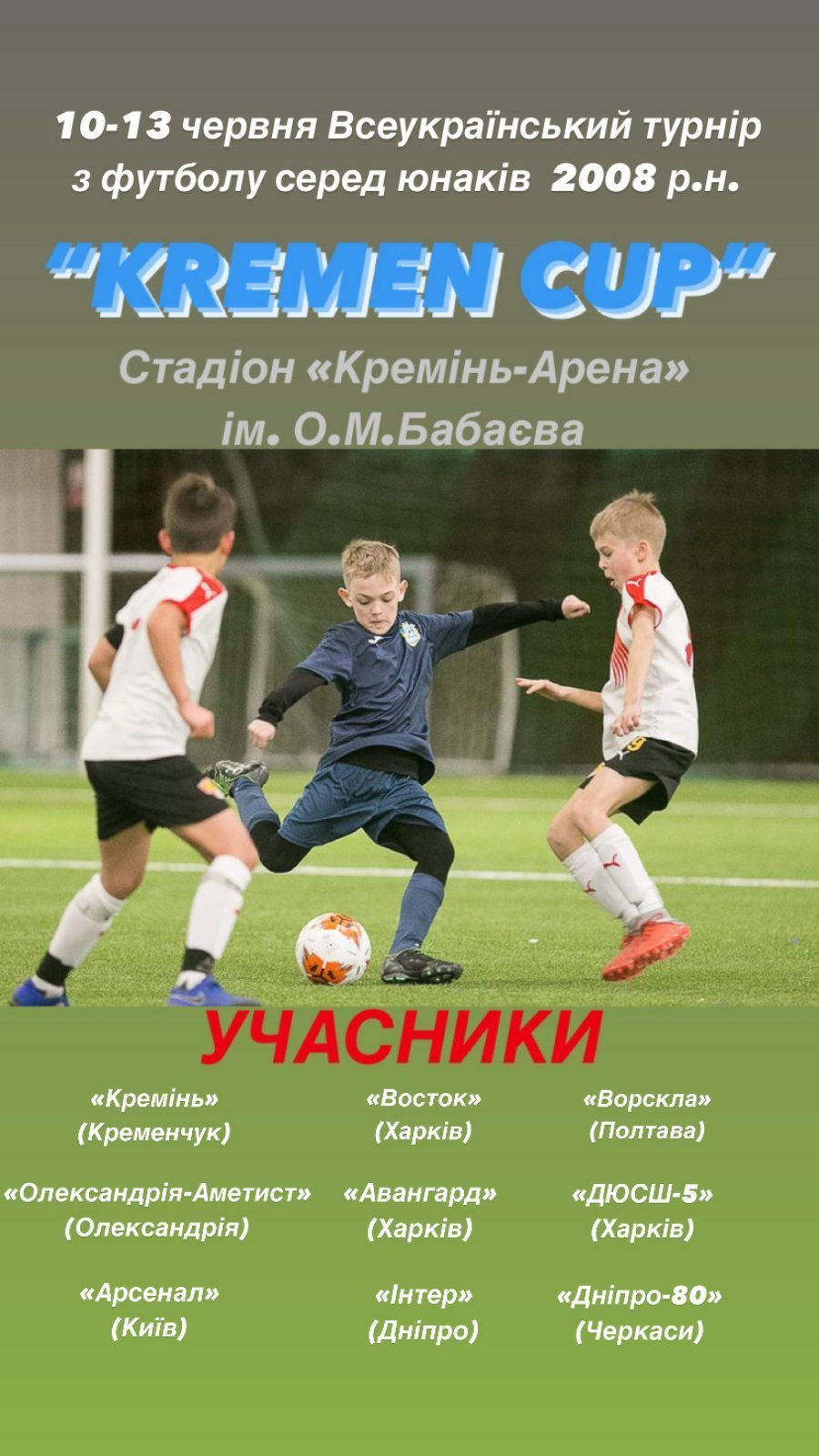 10 червня у Кременчуці розпочнеться Всеукраїнський турнір з футболу серед юнаків 2008 р.н. «Кremen cup». Змагання відбудуться на стадіоні «Кремінь-Арена» ім. О.М.Бабаєва.