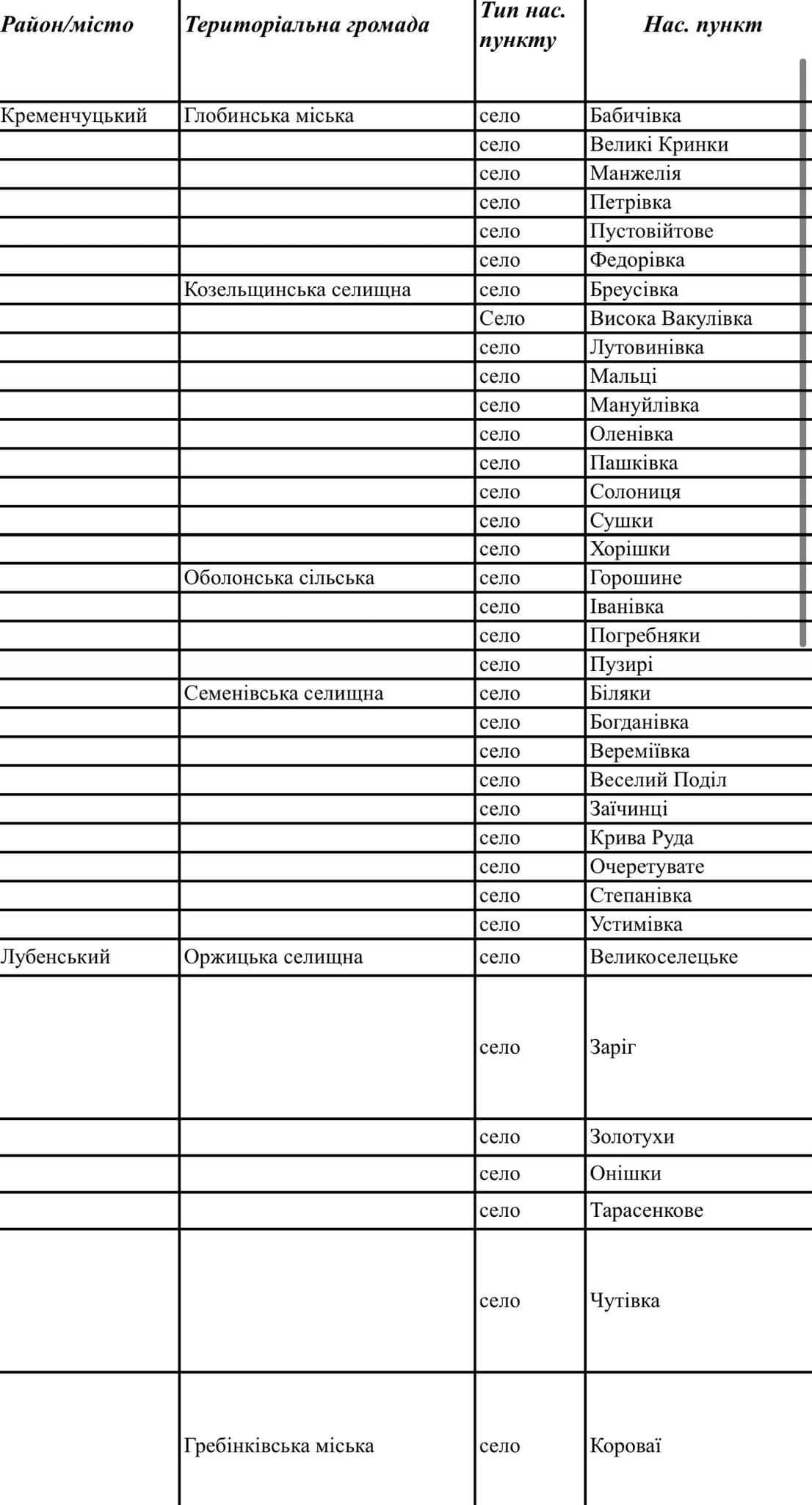 - Глобинська міська територіальна громада: село Бабичівка, Великі Кринки, Манжелія, Петрівка, Пустовійтове, Федорівка
