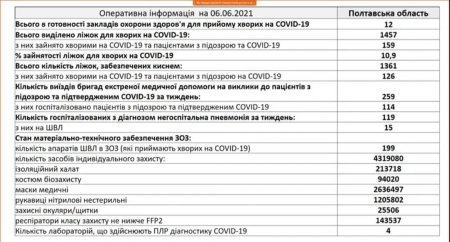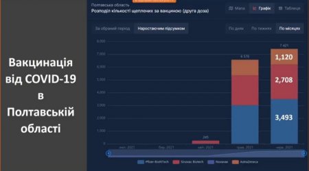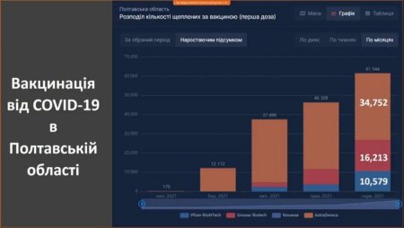 На вакцинацію через додаток «Дія» загалом записалось 15956 мешканців області. В новостворених Центрах вакцинації населення протягом вихідних першу дозу препарату CoronaVac отримало 3650 людей: (1600 – в Полтаві, 1100 – в Кременчуці, по 350 – в Лубнах і Горішніх Плавнях, 250 – в Миргороді).