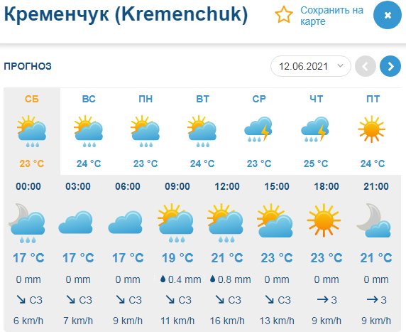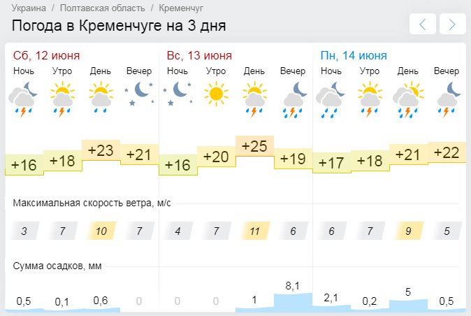 На выходных дожди с грозами в Кременчуге продолжатся; прогноз на следующую рабочую неделю такой же.