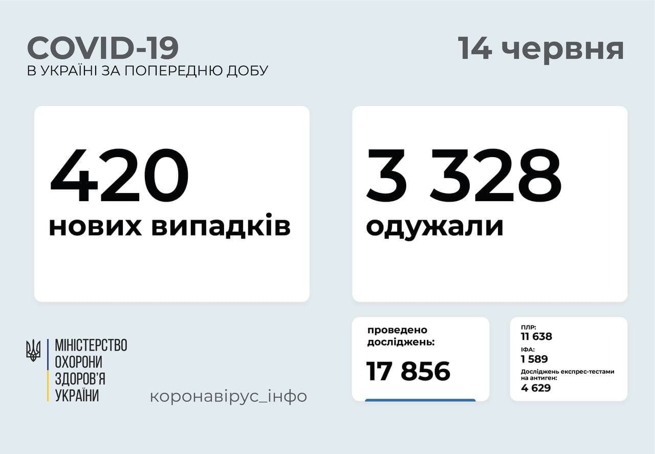 Щодо ситуації з COVID-19 в Україні, то станом на ранок 14 червня коронавірусну хворобу підтвердили у 420 осіб. Зокрема, захворіло 32 дитини та 2 медичних працівники.