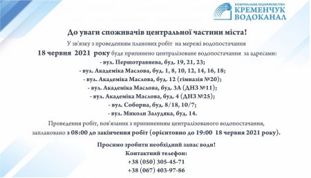 КП «Кременчукводоканал» попереджає, що 18 червня мешканцям центральної частини міста слід чекати на тимчасові перерви у водопостачанні. Підприємство планує виконати перепідключення водопроводу у водопровідну мережу по вул. Академіка Маслова, 21.