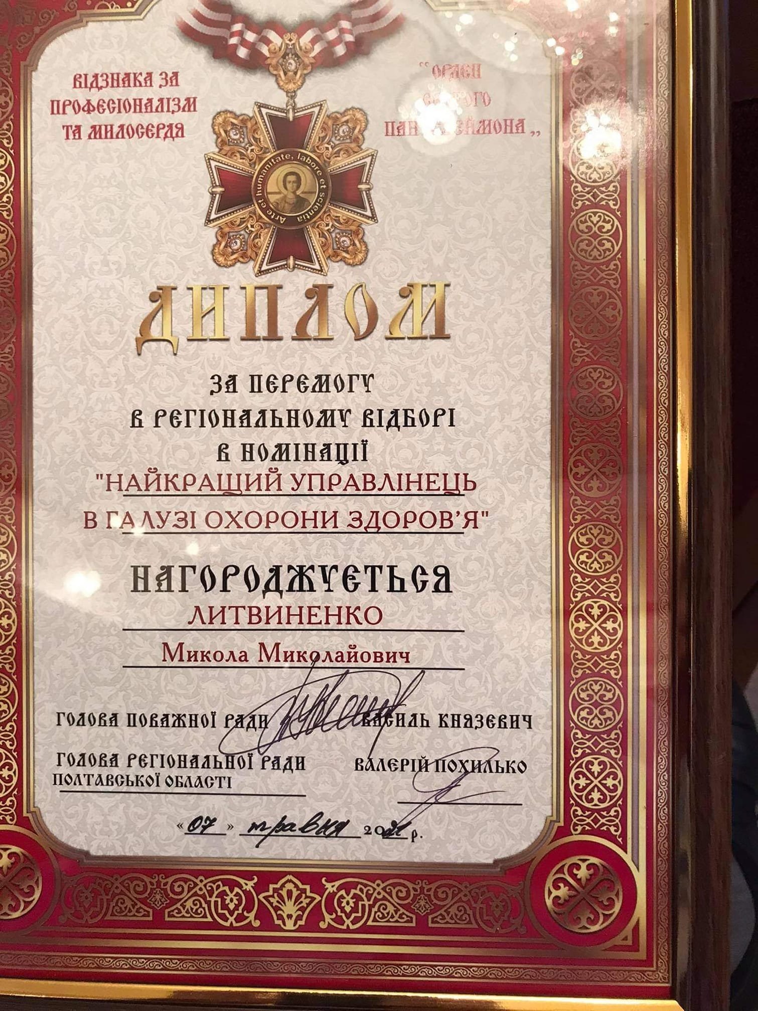 Директора Кременчуцького обласного клінічного шпиталю Миколу Литвиненка нагородили Відзнакою переможця регіонального відбору «Орден Святого Пантелеймона» у номінації «Найкращий управлінець в галузі охорони здоров’я».