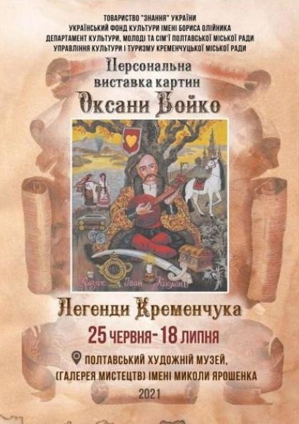 З 25 червня у Полтаві презентують персональну виставку картин кременчуцької художниці Оксани Бойко «Легенди Кременчука». Про це інформував місцевий художник Сергій Горюнович у фейсбуці.