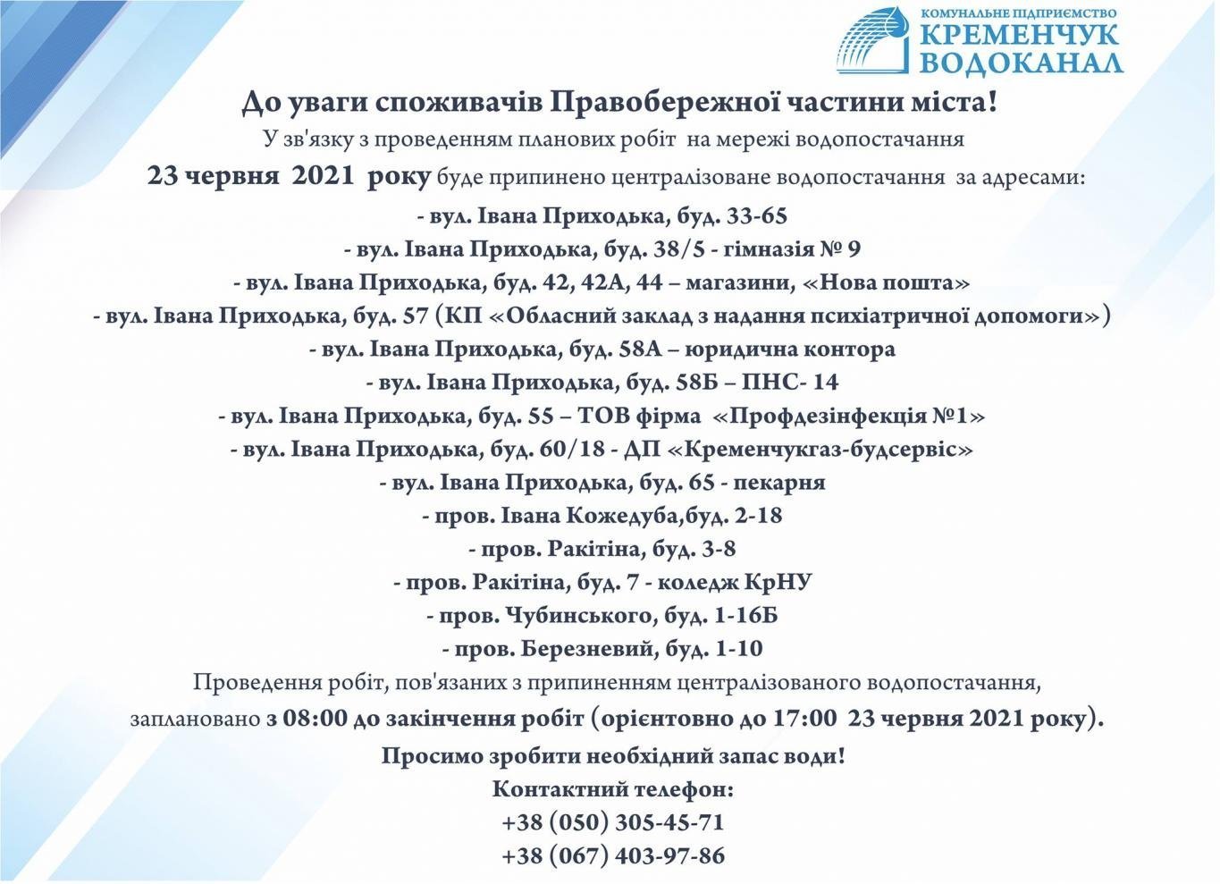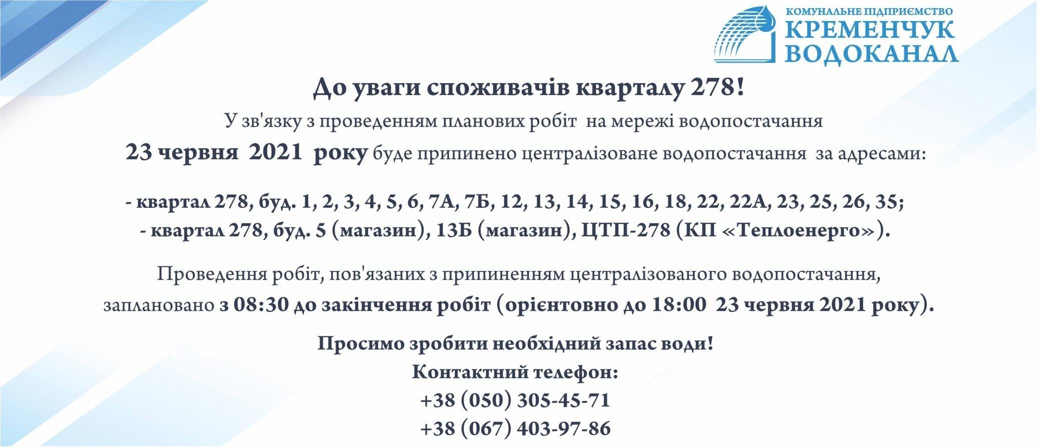 КП «Кременчукводоканал» попереджає мешканців правобережної частини міста та кварталу 278 про тимчасове відключення централізованого водопостачання 23 червня. Фахівці проведуть ремонтні роботи і заміну засувок та просять людей завчасно зробити запаси води.