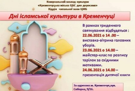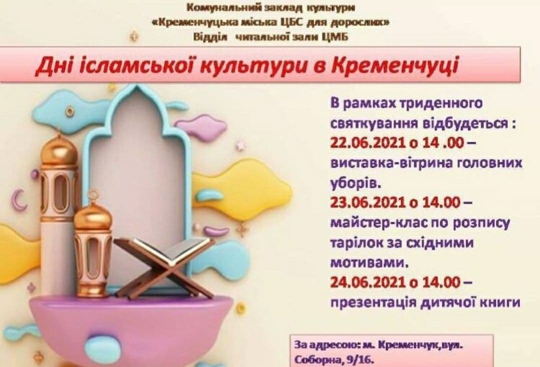 Всі заходи проходитимутьу читальній залі ЦМБ і організовані силами Кременчуцької філії Всеукраїнської асоціації мусульманок «Аль-Аміра»