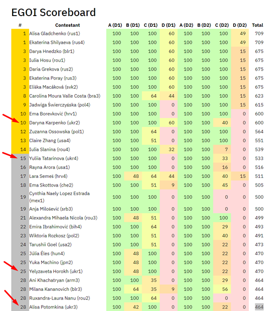 І Європейська дівоча олімпіада з інформатики (EGOI 2021)* проходила 11-18 червня. Вона повинна була відбутися очно у Цюріху (Швейцарія), але проведена онлайн (очно в кожній країні-учасниці). В олімпіаді взяло участь 157 школярок з 43 країн.