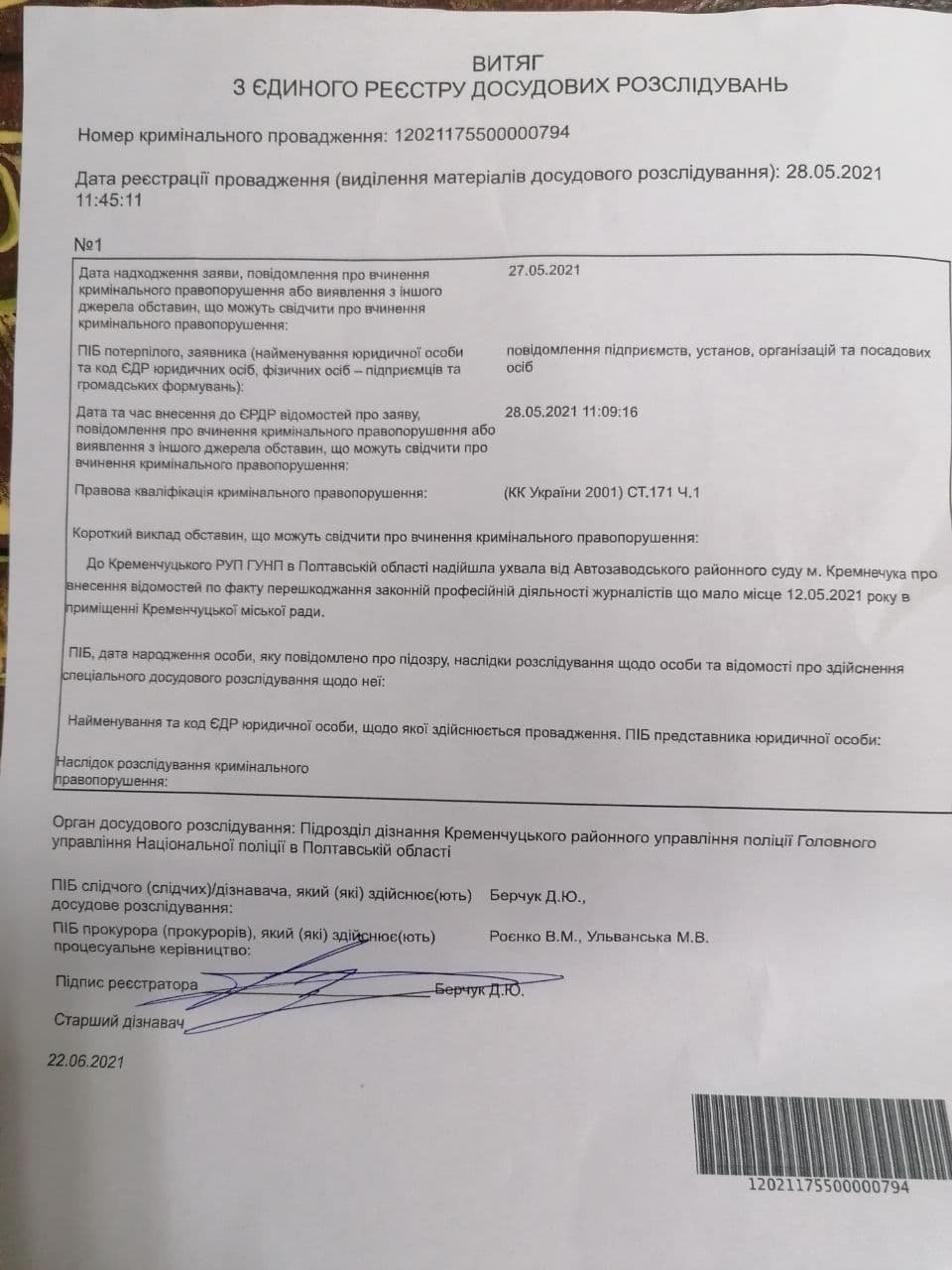 Правоохоронці розслідують кримінальну справу за фактом перешкоджання журналістській діяльності. Наразі йде допит потерпілих та свідків. Серед потерпілих і наш журналіст Альона Душенко, журналісти міських видань «Програма плюс», «Кременчугская газета», телекомпанії «Візит».