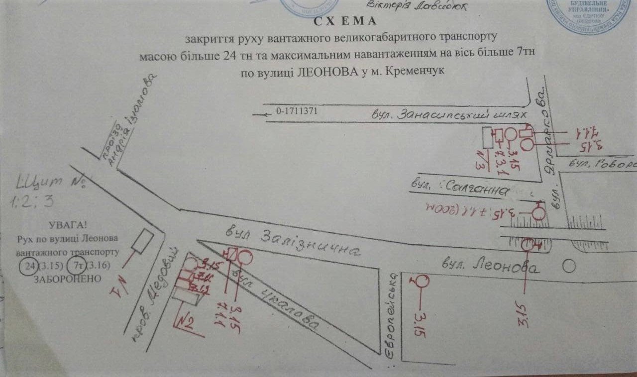 У місті заборонили рух вантажного великогабаритного транспорту загальною вагою вище 24 т і навантаженням на вісь більше 7т по вулиці Леонова. Таке рішення ухвалив 2 червня виконком Кременчуцької міськради.
