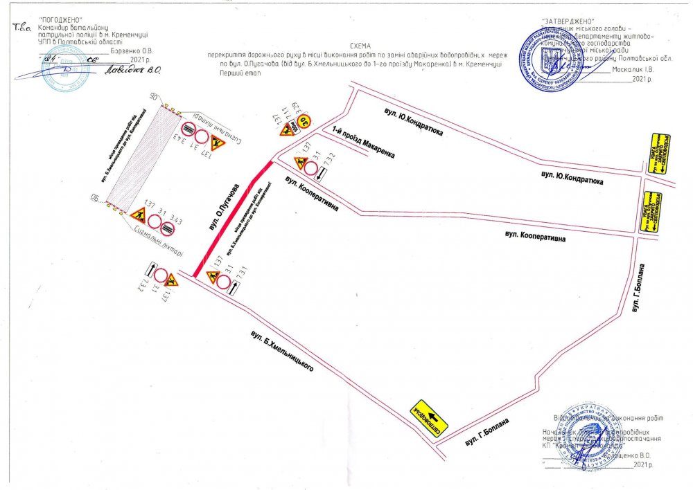 У Кременчуці тимчасово закриють рух автотранспорту по вулиці Омеляна Пугачова від вул. Богдана Хмельницького до проїзду 1-го Макаренка, а саме: