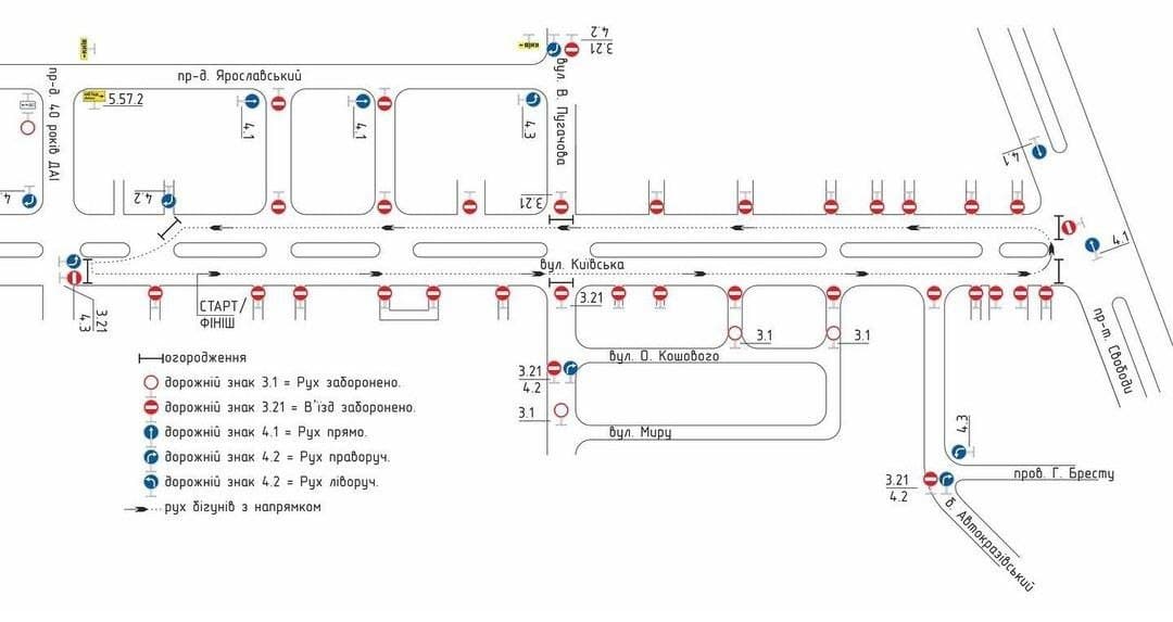 Півмарафон відбудеться по вулиці Київській, рух і всі виїзди з дворів 25 вересня з 8.00 до 12.00 буде повністю перекрито.