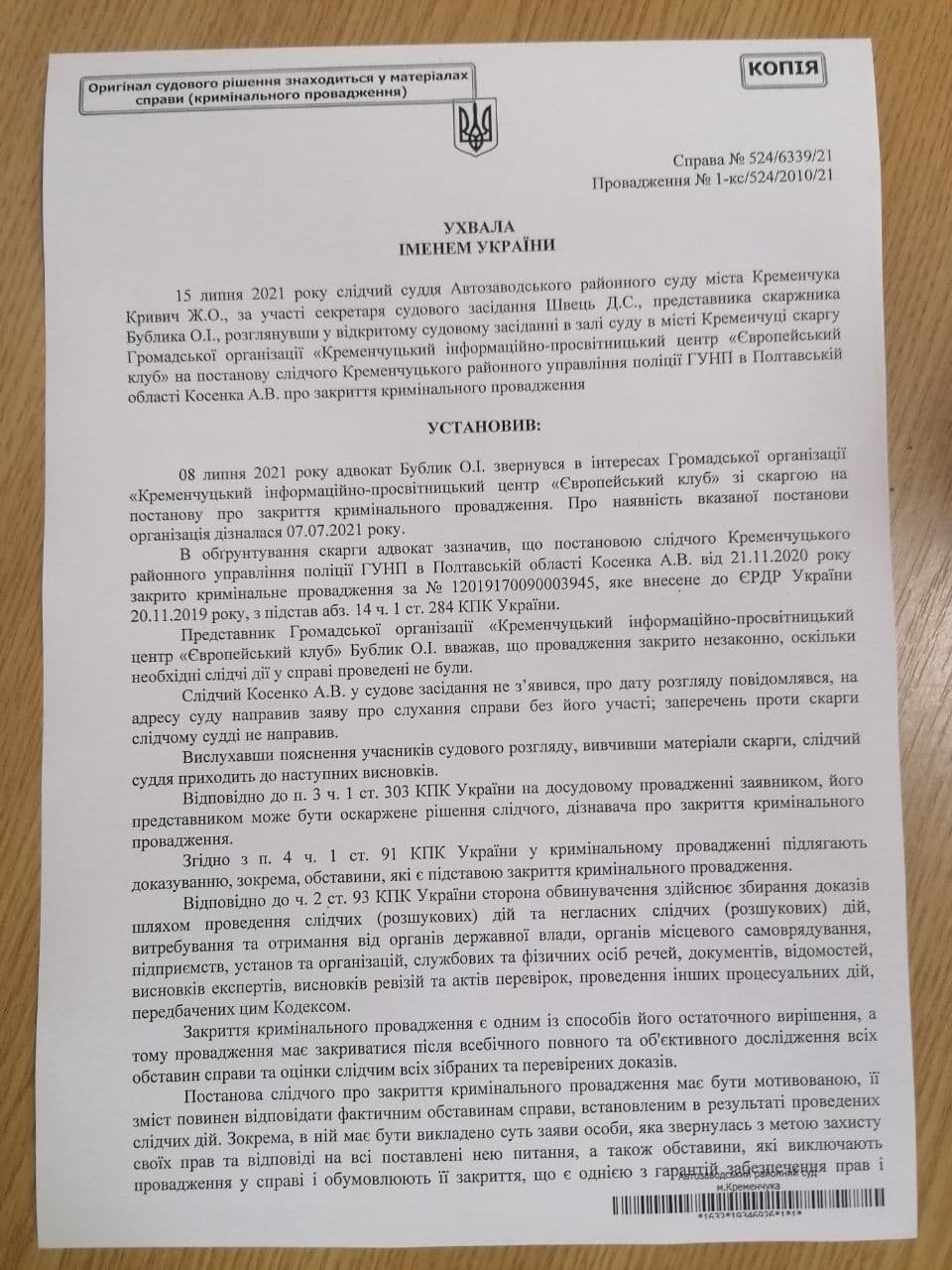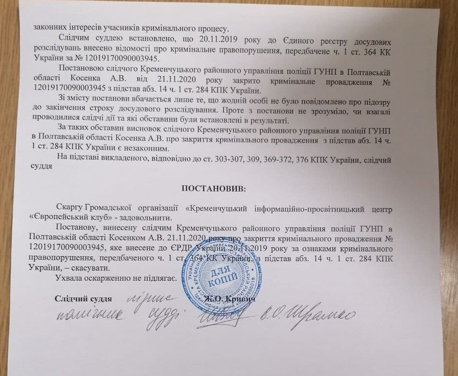 15 липня Автозаводський районний суд Кременчука (слідчий суддя Жанна Кривич) розглянув скаргу ГО «Європейський клуб» на незаконне закриття поліцією кримінальної справи про агітки Шаповалова. Суд повністю задовольнив скаргу заявника – ГО «Європейський клуб» і скасував постанову слідчого Кременчуцького районного управління поліції ГУНВП у Полтавській області Косенка А.В. про закриття кримінального провадження.