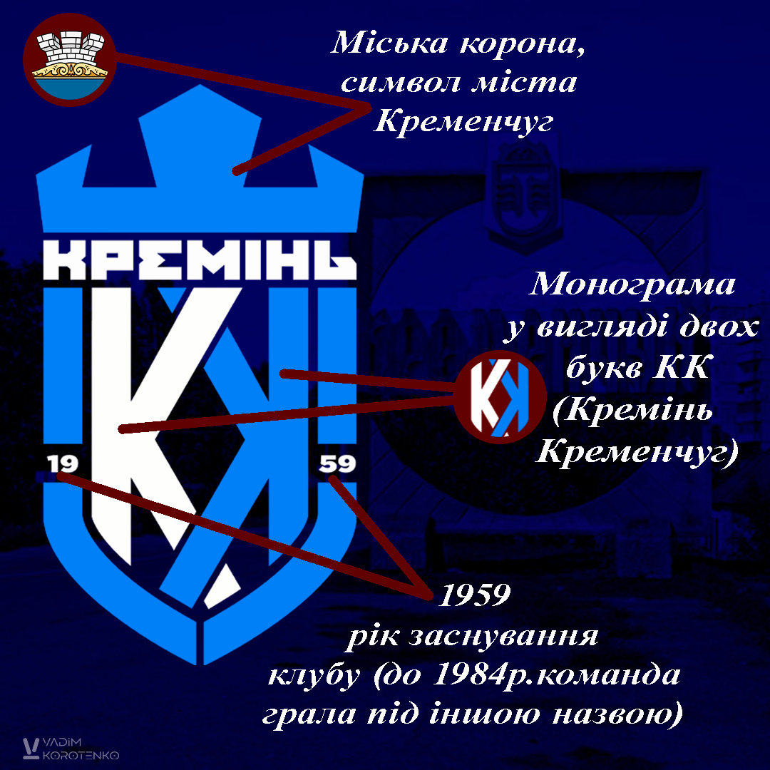 – Емблема виконана в біло синіх кольорах як і було сказано в умовах конкурсу. Світло синій колір – колір прапора міста. Корона над щитом – означає міську корону. Щит – символ перемоги й захисту, який також є одним із символів міста Кременчука. Дві букви К зображені у вигляді монограмами, – зауважив Вадим Коротенко.