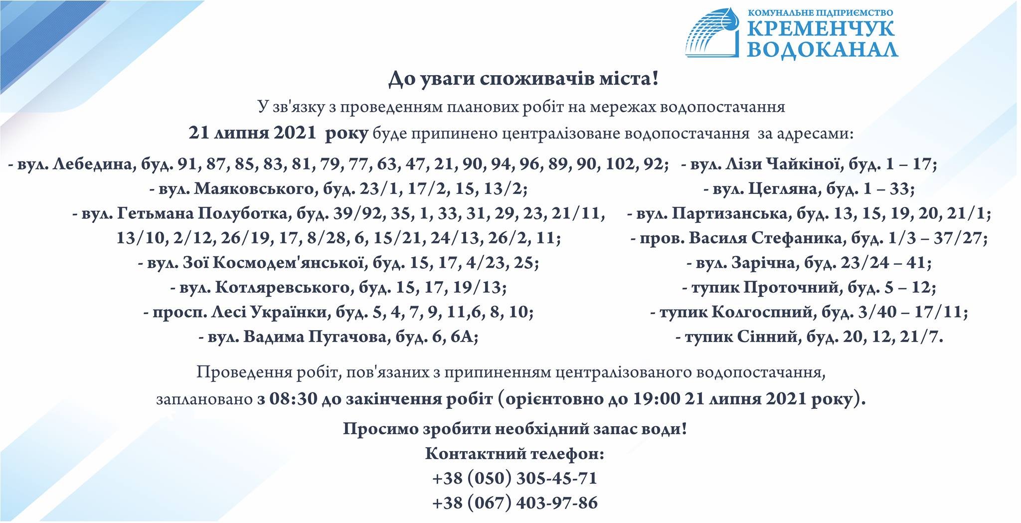 КП «Кременчукводоканал» повідомляє, що 21 липня планується заміна двох засувок на водогоні по вулиці Лебединій, 79 і на перехресті вулиць Ватутіна та Маяковського. У зв’язку з проведенням робіт відбудеться припинення водопостачання до ряду житлових будинків з 8.30 до 19.00 (орієнтовно).