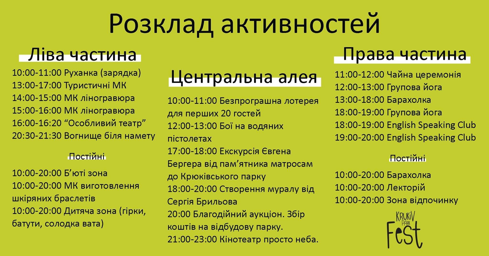 31 липня з 10:00 до 23:00 у «Парку Крюківський» відбудеться фестиваль «Krukiv Park Fest». Захід проводиться з метою популяризації сімейного відпочинку, пропаганди здорового способу життя серед дітей та молоді, розвитку талановитої молоді та організації змістовного сімейного дозвілля.