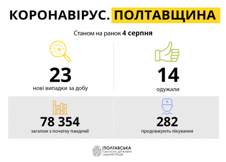 За весь час пандемії на Полтавщині COVID-19 виявили у 78 354 людей, з яких 76 198 одужали, а 282 продовжують лікування. Зареєстрували 1 874 летальні випадки.