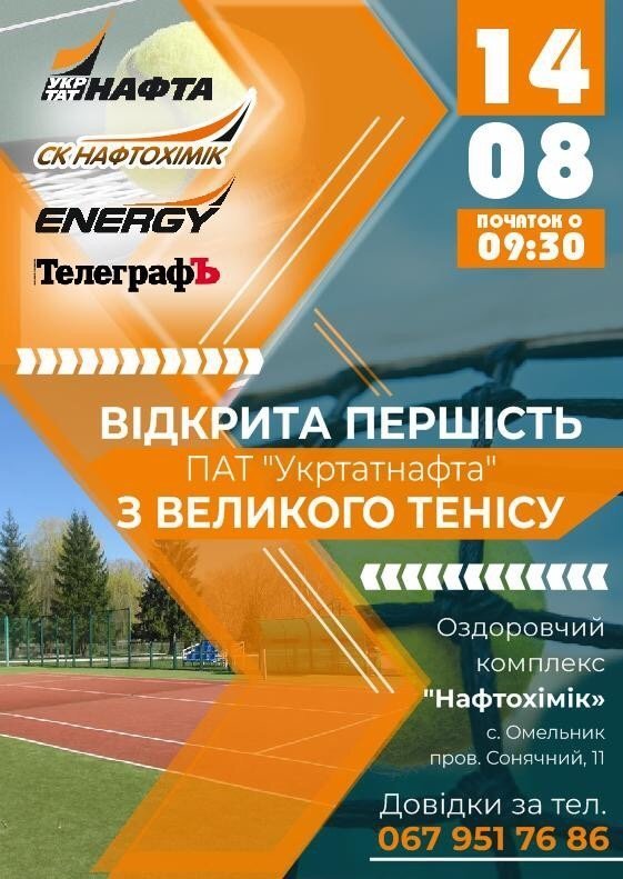 14 серпня о 9.30 відбудеться відкрита першість ПАТ «Укртатнафта» з тенісу. Змагання з тенісу відбудуться в оздоровчому комплексі