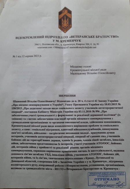 Керівник відокремленого підрозділу громадської організації «Ветеранське братство» Микола Маменко направив звернення міському голові Кременчука Віталію Малецькому, в якому пропонує утворити Координаційну раду учасників бойових дій, членів їх сімей та членів сімей загиблих (померлих) ветеранів антитерористичної операції/операції об’єднаних сил (далі – АТО/ООС), учасників бойових дій на території інших держав при Кременчуцькій міській раді та виконкому міської ради зі статусом консультативно-дорадчого органу.