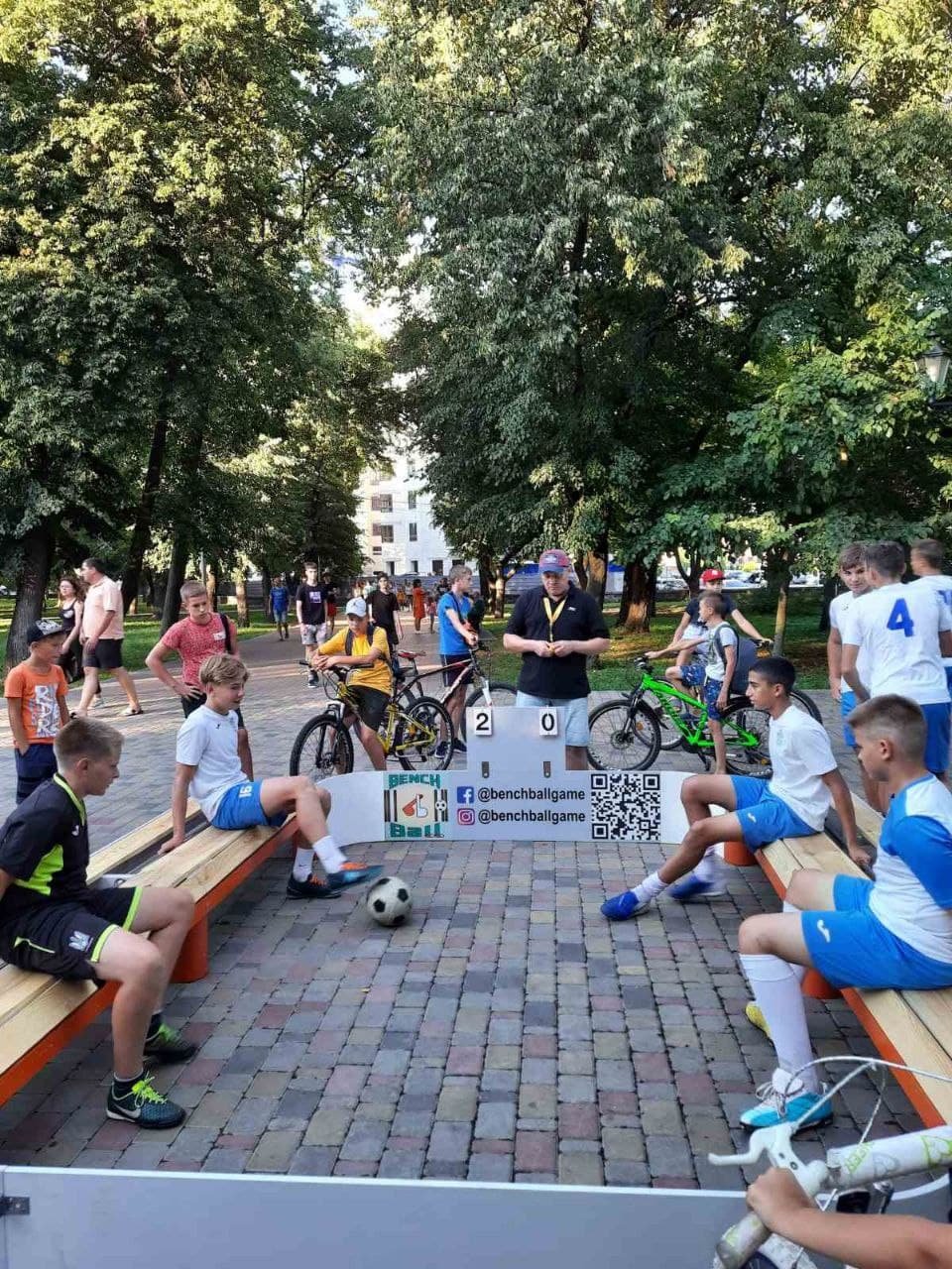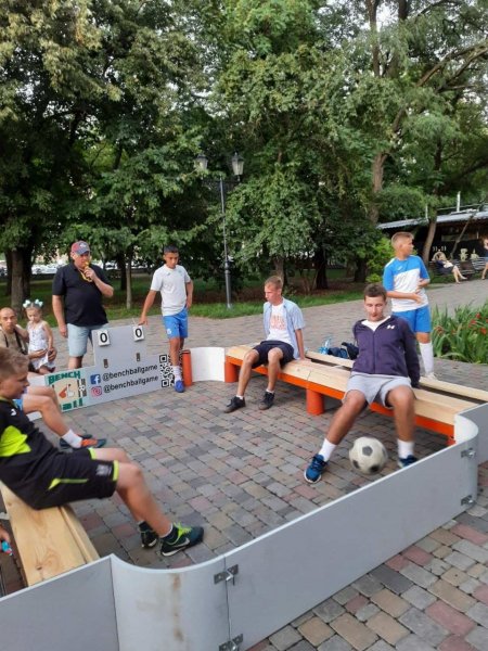 Bench ball game відрізняється від звичайного футболу тим, що граєш сидячи на спеціально сконструйованій лавці. Гравці одночасно й нападники, і воротарі.