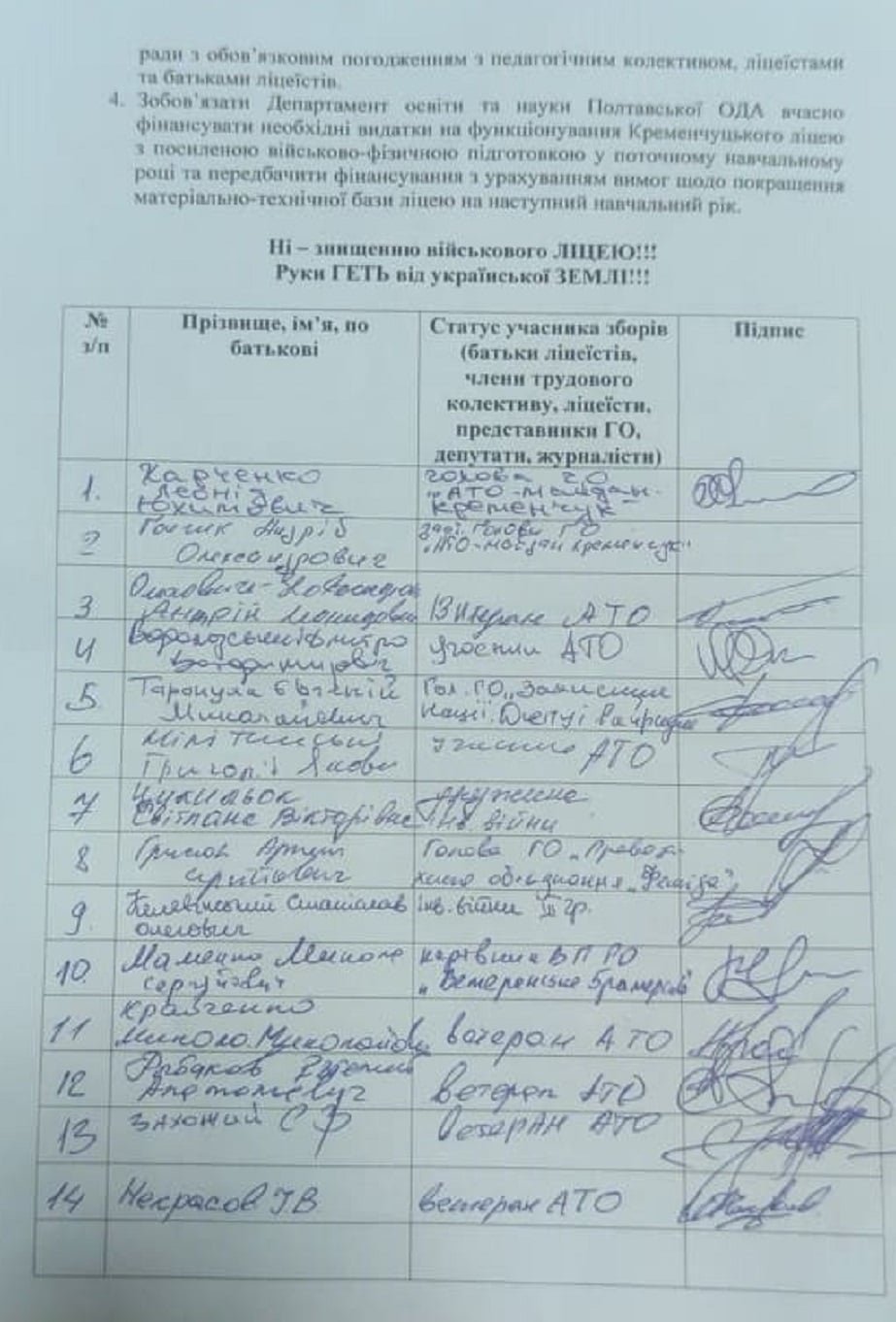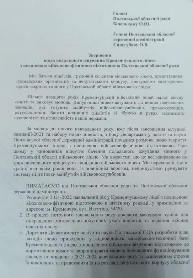 Голові Полтавської облради Олександру Біленькому та голові Полтавської ОДА Олегу Синєгубову направили звернення щодо подальшого існування Кременчуцького ліцею з посиленою військово-фізичною підготовкою. Лист направили від імені батьків ліцеїстів, трудового колективу військового ліцею, представників громадських організацій та депутатського корпусу. У зверненні йдеться, що представники категорично проти закриття єдиного у Полтавській області військового ліцею.
