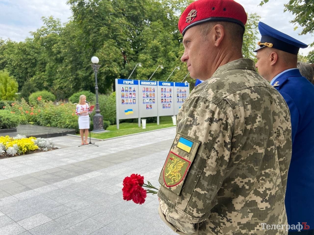 На фото праворуч капітан Іван Федорашко в прапороносній групі Військової академії м. Одеса. А також беруть участь: майор Сергій Волинський – заступник командира батальйону окремої бригади морської піхоти – колона бойових машин. Старший лейтенант Богдан Головаш – командир МБАК «Бердянськ» корабельна група на Дніпрі.