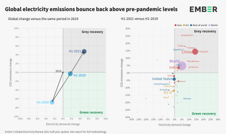 Згідно дослідженню аналітичного центру Ember, яке порівнює рівень викидів в атмосферу у першому півріччі 2021 року з аналогічним періодом 2019 року, обсяг шкідливих викидів у світі за цей час збільшився на 5%. Головною причиною вважають ріст споживання вугілля - саме воно є основним джерелом енергії для країн, що розвиваються. Спеціалісти вивчили данні з 68 країн, які споживають 87% усієї світової енергії.