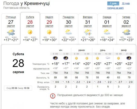 Gismeteo повідомляє, що хмари не блукатимуть по кременчуцькому небу у найближчі два дні; вихідні пройдуть без опадів. Повітря прогріється від +15°С до +30°С.