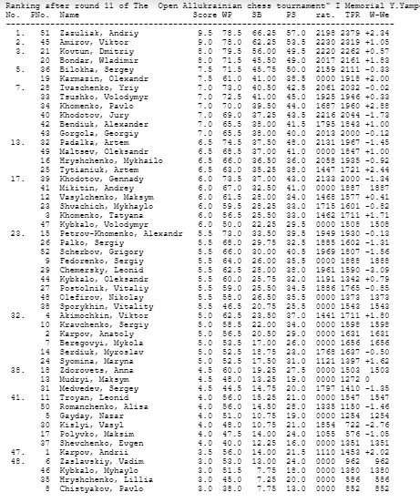 Серед юніорок кращою стала Тетяна Хоменко, а серед ветеранів-жінок Лілія Грищенко, з успіхом грала за команду Полтавської області в першості України. Бажання перемогти було у багатьох, а в підсумку переміг кременчуцький майстер Андрій Зазуляк, лише 3 партії з 11 звівши внічию і вигравши інші. Зробивши на одну нічию більше і розділивши з переможцем очки другим також став кременчужанин, кандидат в майстри спорту, багаторазовий чемпіон Кременчука Віктор Аміров. Ще більше на одну нічию і третє місце у Дмитра Ковтуна з Горішніх Плавнів. Наступний земляк, кандидат в майстри спорту Володимир Бондар. Замкнув п’ятірку полтавець Сергій Белоха. Призери крім медалей і грамот отримали цінні призи, також як і кращі учасники в окремих категоріях. Зауважимо, що турнір пам’яті Юрія Ямпольского планують зробити щорічним.