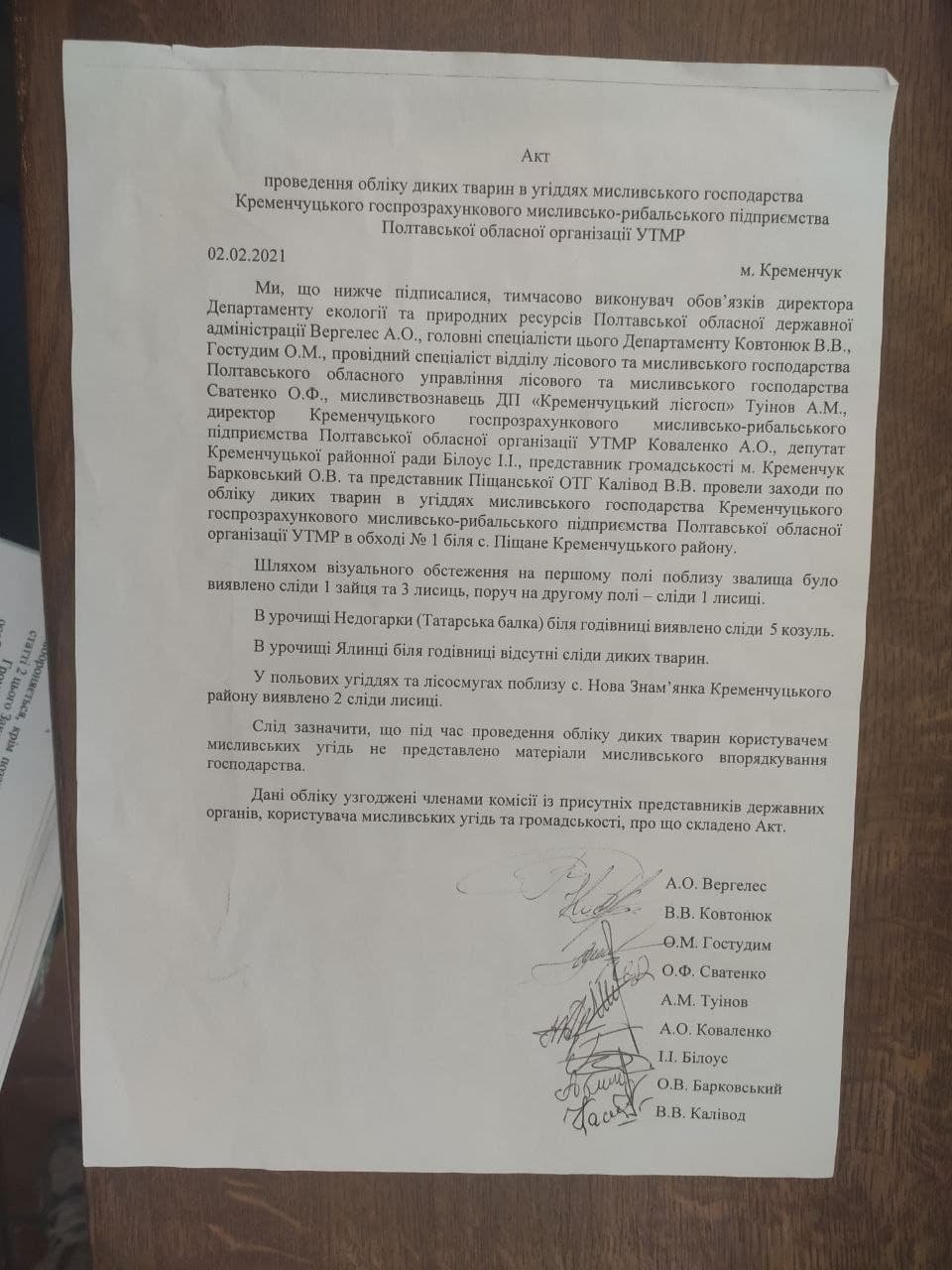Олександр Корецький розповів, що точно сказати, скільки тварин того чи іншого виду живе на території угідь, наразі неможливо. За законом, для проведення обліку тварин необхідно залучати представників органів місцевого самоврядування, екологічної інспекції та державного лісового фонду. На останню перевірку інспекторів не запрошували – а просто поінформували про її проведення, до того ж заднім числом.
