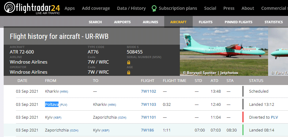 За даними сервісу FlightRadar24, літак компанії Windrose Airlines о 12:40 вилетів з полтавського аеропорту та приземлився у Харкові о 13:12.
