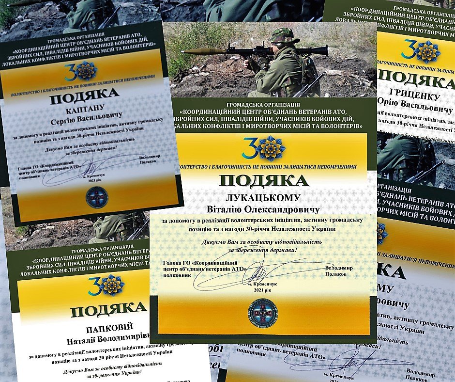 Подяки та слова вдячності від Координаційного центру об'єднань ветеранів АТО отримали: Едуард Гожий (Полтава), Юрій Гриценко, Сергій Каптан, Віталій Лукацький, Сергій Кулясов, Семен Лещинський, Сергій Лисенко (Полтава), Микола Несен, Світлана Орленко, Наталія Папкова, Сергій Сниткін, Наталія Сорока, Надія Суховієнко, Наталія Талипова (Полтава), Ксенія Тарасова, Вячеслав Яворський.