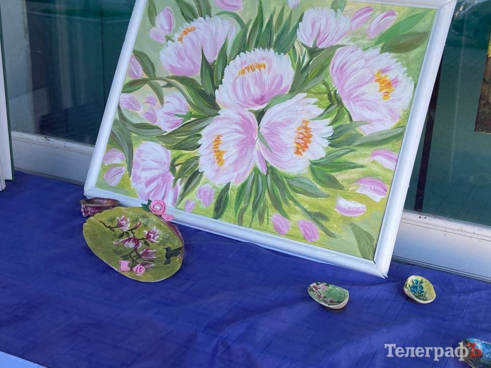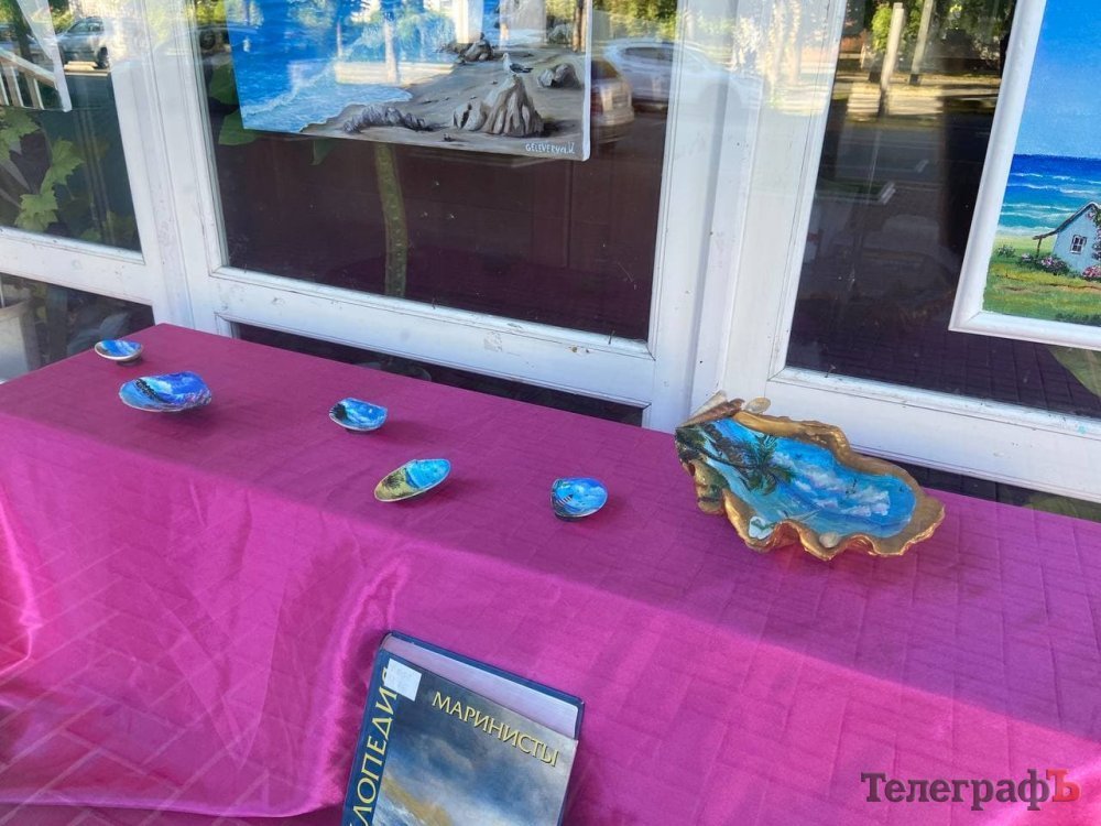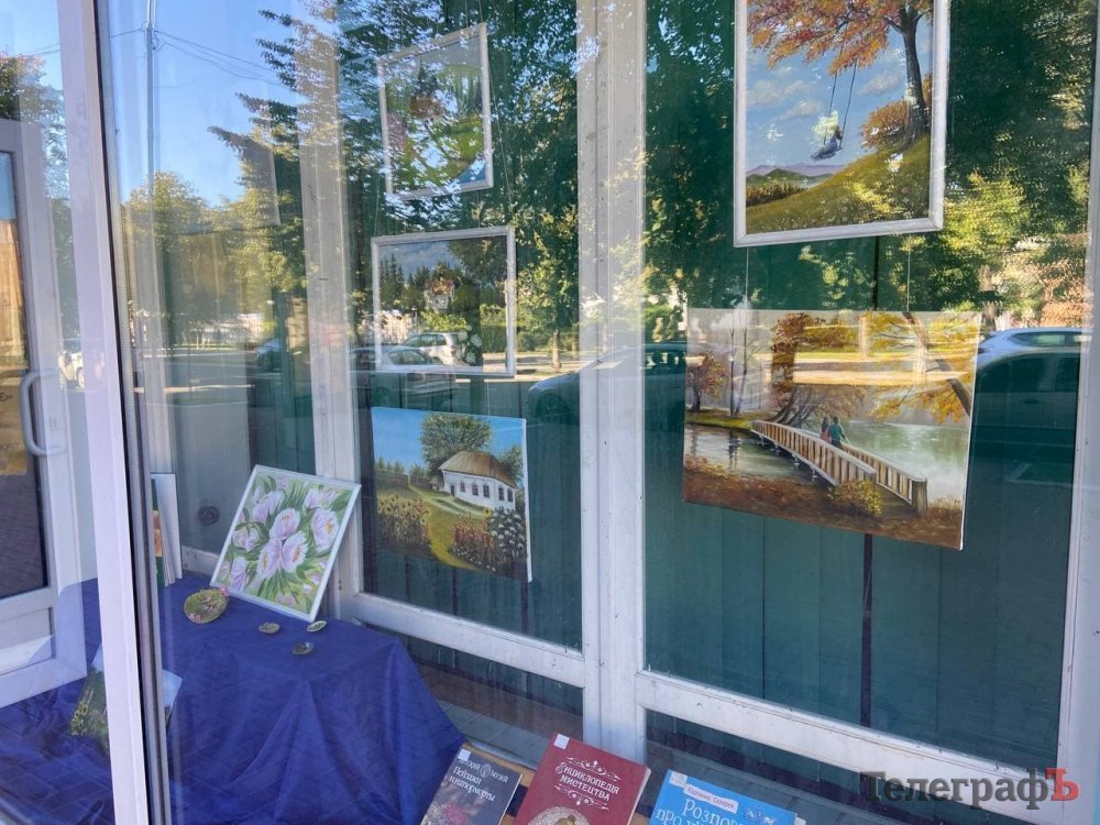 На вітринах дитячої бібліотеки представили виставку картин та мушель мисткині з Градизька Вікторії Гелевері. Художниця-аматорка за допомогою мистецтва та пензля розробляла руку.