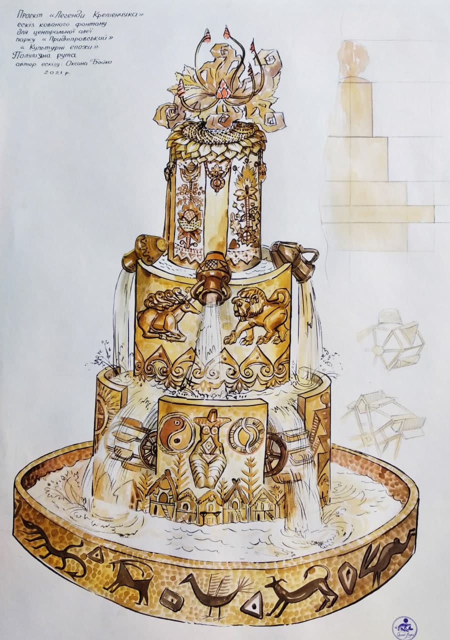 Новий проєкт кованих локацій для парку «Придніпровський» містить 9 ескізів по легендах, проєкт фонтану «Культурні епохи» та ковану арку-фортецю до 450-річчя Кременчука.