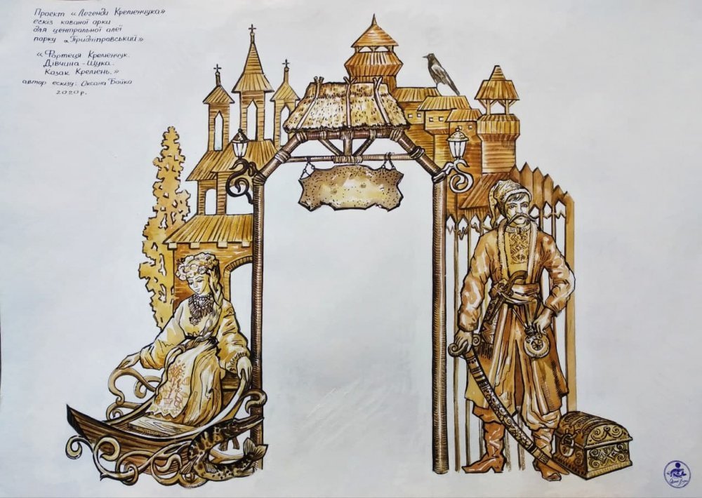 Першим етапом є виготовлення арки «Легенди Кременчука: Фортеця. Дівчина-щука. Козак Іван Кременчук». Це оригінальна композиція з металу висотою 4 м, завширшки 5 м. Центральна частина нагадує ворота фортеці і виконана з колон циліндричної форми з характерними розпорами та фактурними з’єднаннями, по центру декоративна таблиця, що нагадує старовинний сувій із написом назви композиції. Про дерев’яне зодчество розповідають архітектурні елементи, що виконані силуетно з проробкою фактур та прорізанням в одній площині: порохові вежі, бійниці і частокіл, трикупольна козацька церква. На даху праворуч є силует птаха – хранителя гетьманського духу і землі – крука. Обабіч арки – декоративні світильники.