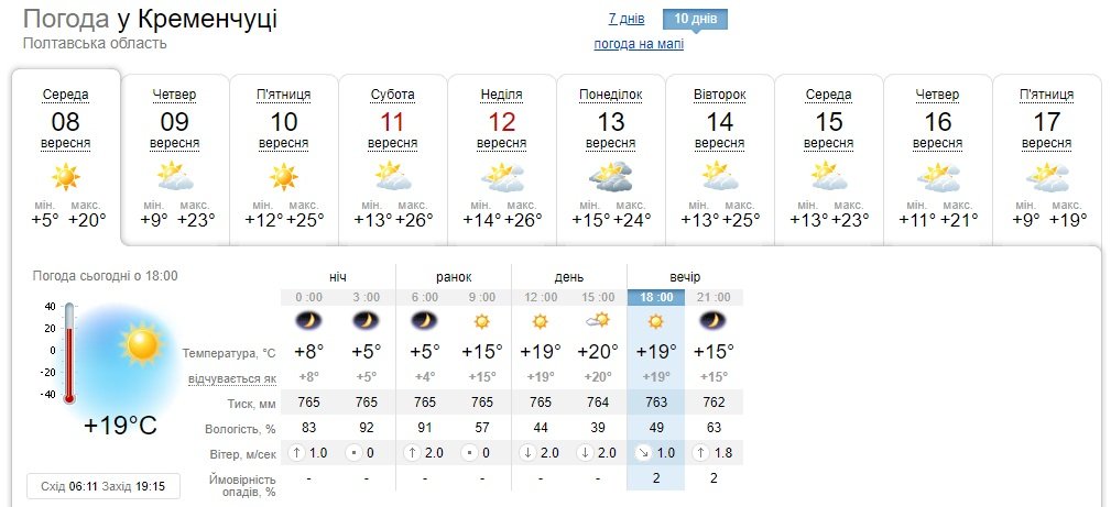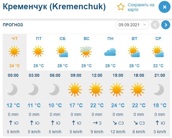 Що стосується Ventusky, цей погодний портал пророкує Кременчуку досить високі як для вересня температурні значення – з суботи, 11 вересня, і до вівторка, 21 вересня, повітря прогріється до рекордних +28-29°С. А от останні два дні цього робочого тижня, четвер і п’ятниця, порадують комфортним температурним режимом – +22-25°С. Дощі найближчим часом не поливатимуть Кременчук, а от сонячних годин буде багато.
