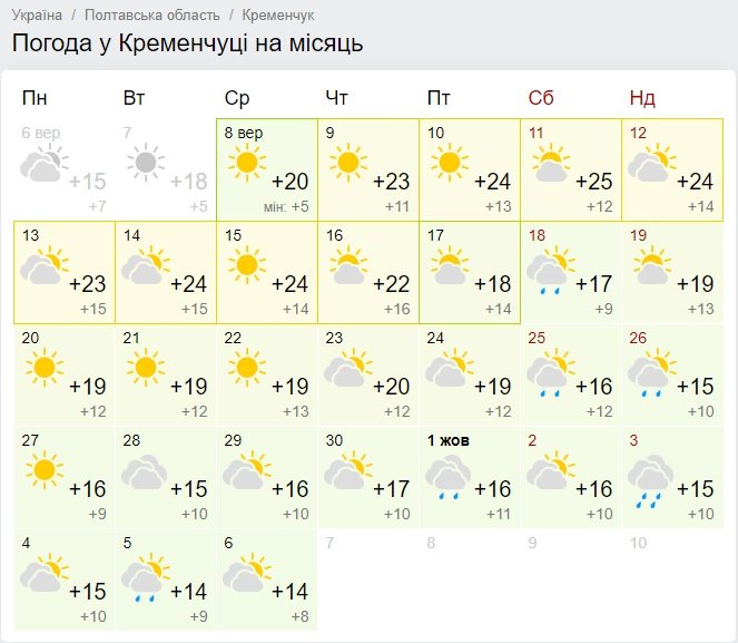 Gismeteo малює ширшу картину, тут бачимо прогноз на місяць. З 8 по 16 вересня стовпчики термометрів показуватимуть у денний час +20-25°С. І лише з 18 вересня почне холодати, але несуттєво – до +17°С. Але з цієї дати почне періодично дощити.