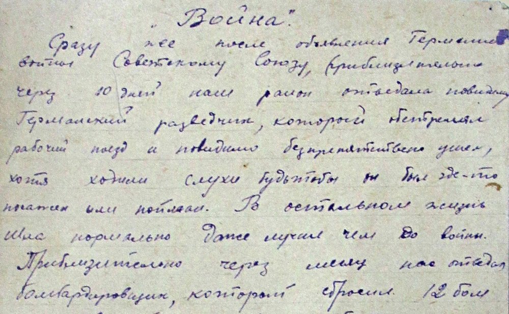 Сразу же после объявления Германией войны Советскому Союзу, приблизительно через 10 дней наш район отведала повидиму Германский разведчик, который обстрелял рабочий поезд и повидимо безпрепятственно ушел, хотя ходили слухи будто бы он был где-то посажен или пойман. В остальном жизнь шла нормально даже лучше чем до войны. Приблизительно через месяц нас отведал бомбардировщик, который сбросил 12 бом на товарный состав и обстрелял его. Бомбы разбили 2а вагона и тяжело ранили паровозную бригаду. Вагоны были с моторами к комбайнам и самолетам.