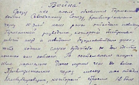 В последнее врем. население очень напугано. Некоторые прячутся в убежища при шуме мотора. Ночью многие не спят. Воздушные тревоги не обявляются, хотя сначала их было слышно. Арт. канонада силно отчетливо. Весь скот выгнат. Призывные и непризывные ребята вывозятся, остаются женщины, дети, больные, некоторые мужчины незнающие чего делать. Стоит неубран хлеб, гниет на поля. Никто ничего не делает. Грозит голод.