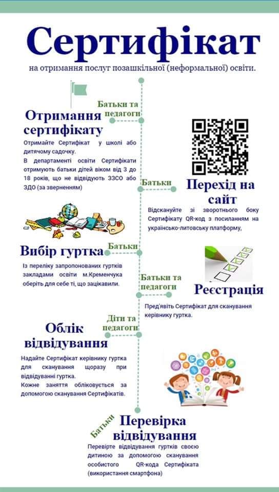 1 вересня стартував соціальний проєкт – сертифікати на отримання послуг з неформальної (позашкільної) освіти для маленьких кременчужан. Кожна дитина віком від 3 до 17 років в перший день навчального року отримала за основним місцем навчання такий сертифікат.
