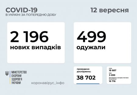 В Україні 12 вересня зафіксували 2 196 нових випадків коронавірусної хвороби. Зокрема, захворіли 236 дітей та 35 медпрацівників.