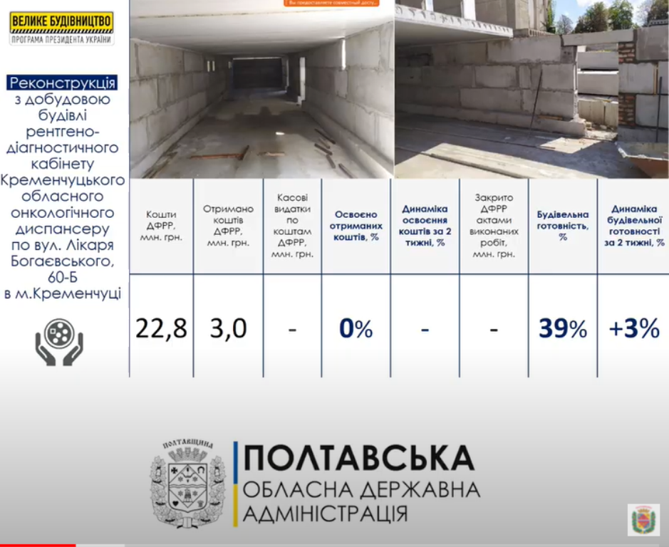 – Надано пропозицію Мінгрегіону щодо додаткового спрямування на цей проєкт 12 млн грн коштів ДФРР за рахунок перерозподілу коштів із Полтавського онкодиспансеру. Нині у Кременчуцькому обласному онкологічному диспансері освоєно 213 тис. грн з обласного бюджету. Будівельна готовність – 39%.